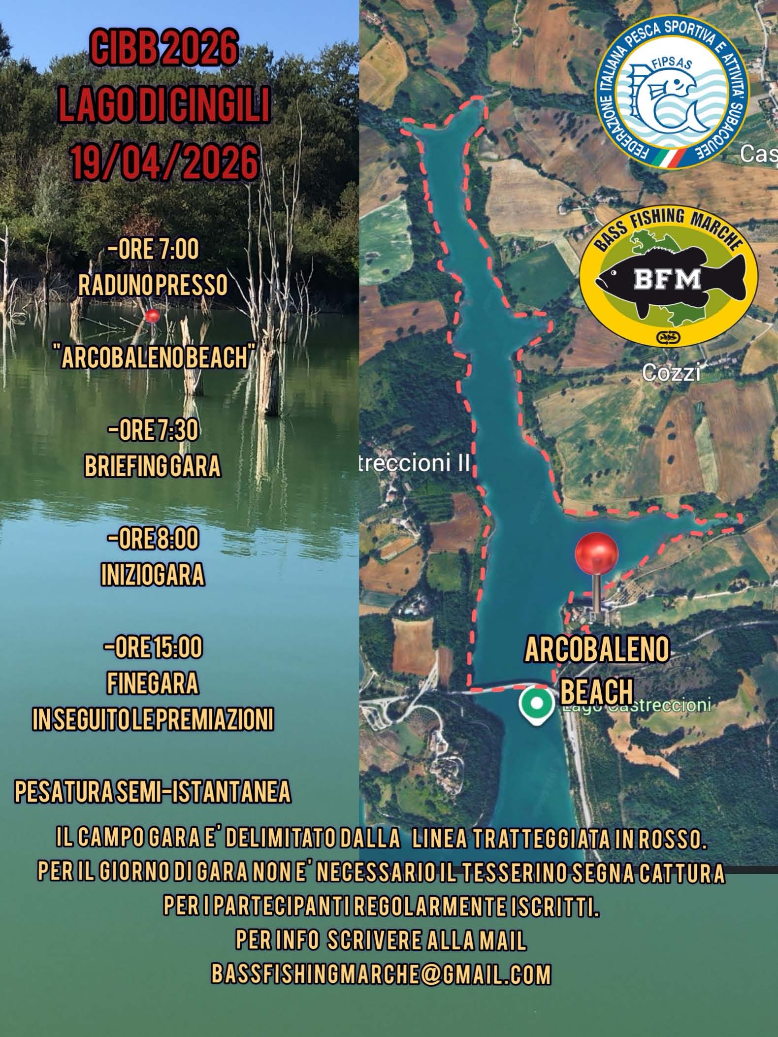 Apertura iscrizioni 3 marzo, chiusura il 20/3/2026 Pagamento iscrizione €50 attraverso bonifico bancario alla asd organizzatrice entro il 20 marzo 2026 La conferma di partecipazione alla finale si configura attraverso l'iscrizione ad entrambe le manches sul Sistema Informatico Federale (SIF) entro i termini previsti. L'eventuale rinuncia alla partecipazione alla gara di finale va inviata entro il 20/3/2026 via email a pesca.superficie@fipsas.it ed a bellyboat@hotmail.it I ripescaggi verranno effettuati fino al 31/3/2026 |