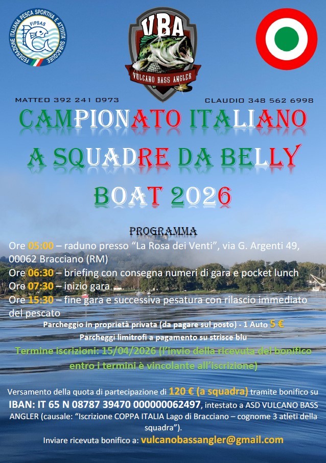 CAMPIONATO ITALIANO INDIVIDUALE ED A SQUADRE BASS FISHING DA BELLY BOAT 2026